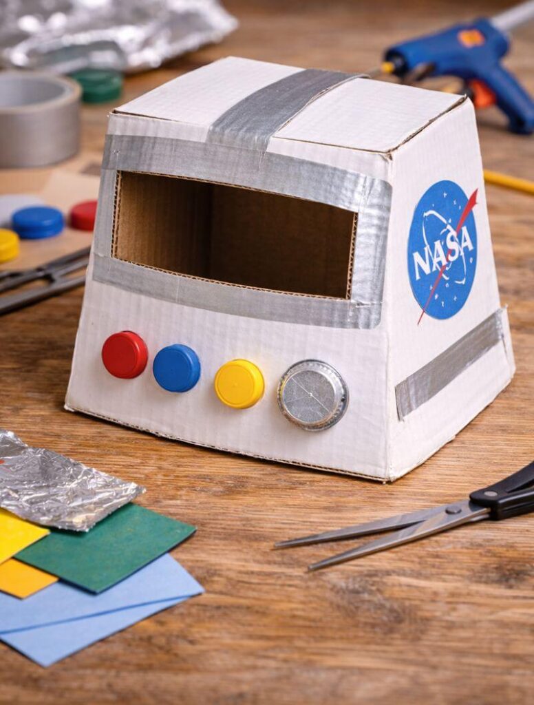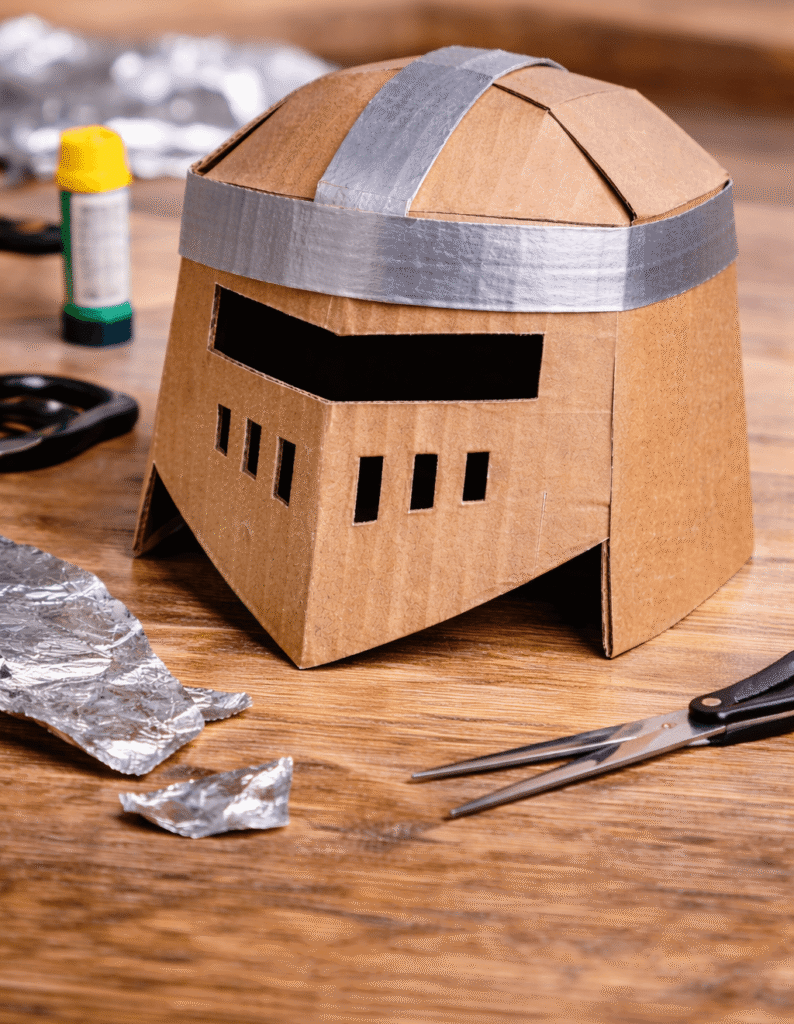 - hełm: wytnij z kartonu półkole, sklej boki taśmą; z przodu doklej prosty „daszek”,