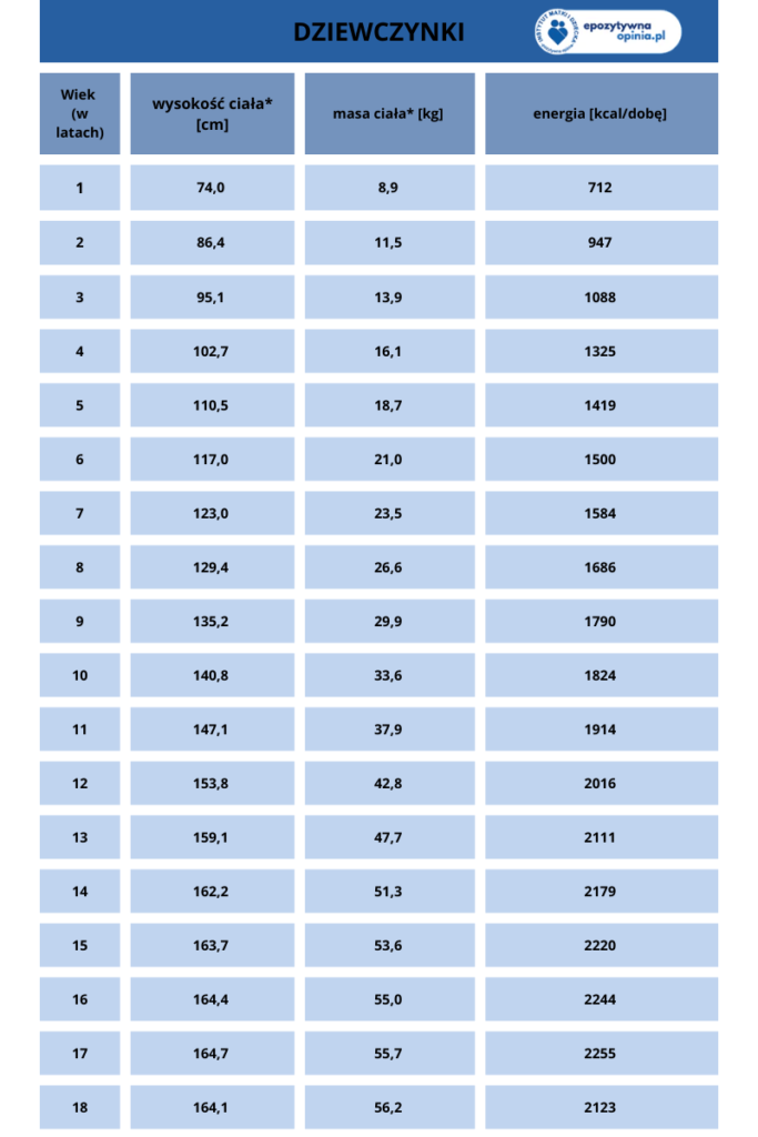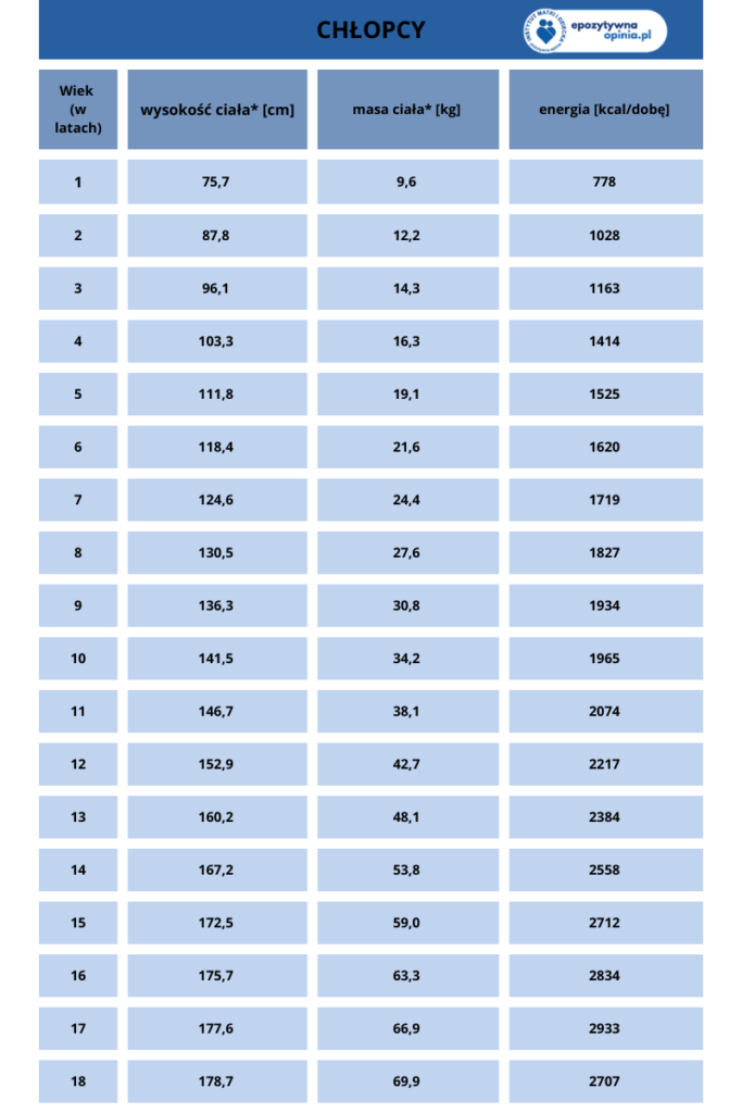 Według aktualnych norm żywienia Narodowego Instytutu Zdrowia Publicznego – Państwowego Instytutu Badawczego (2024 r.) przyjmuje się, że zalecane spożycie energii, w zależności od wieku, wysokości i masy ciała, płci dziecka i przy umiarkowanej aktywności fizycznej, wynosi od 712- 1163 kcal na dobę dla 1-3 latków, oraz do 2244 (dziewczęta) i 2707 kcal (chłopcy) w przypadku 16-18 latków. Szczegółowe dane przedstawia poniższa tabela.